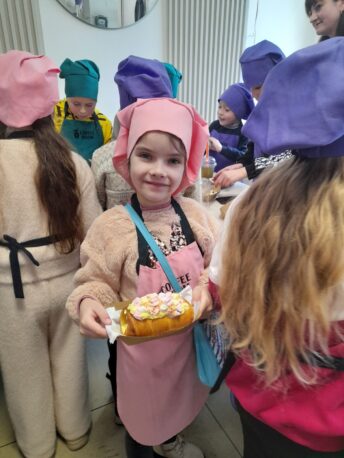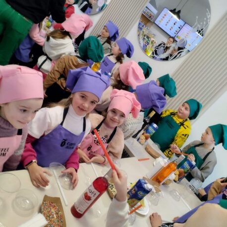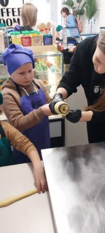 Найбільше захоплення викликало власноручне приготування Bubble Tea 🧋 та ароматного Chimney Cake (Kürtőskalács) або кренделика 🥨. Діти з радістю **пекли, прикрашали та створювали свої солодкі шедеври.✨